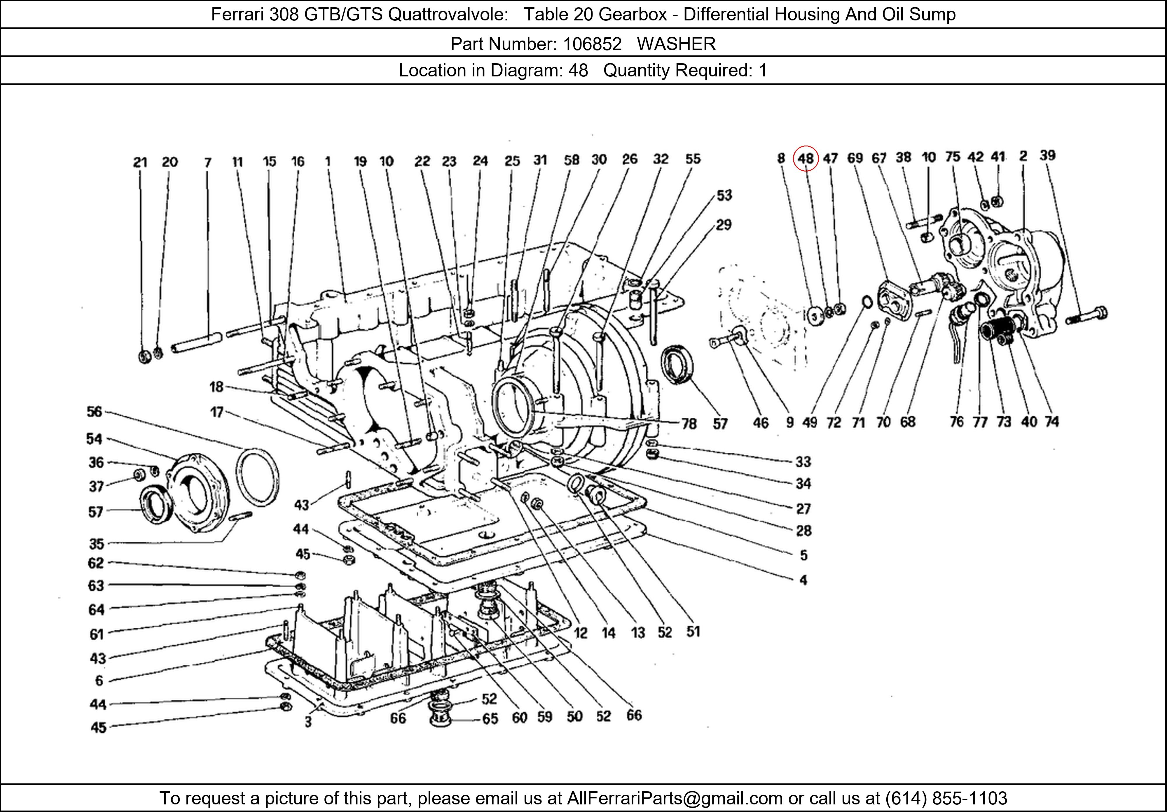 Ferrari Part Number 106852, WASHER shown here as used in Ferrari 308 GTB/GTS Quattrovalvole Table 20 Gearbox - Differential Housing And Oil Sump. Location in Diagram: 48. Required Quantity: 1. This Ferrari part is used in more than one diagram. Click on the diagrams below to see alternative uses of this part: