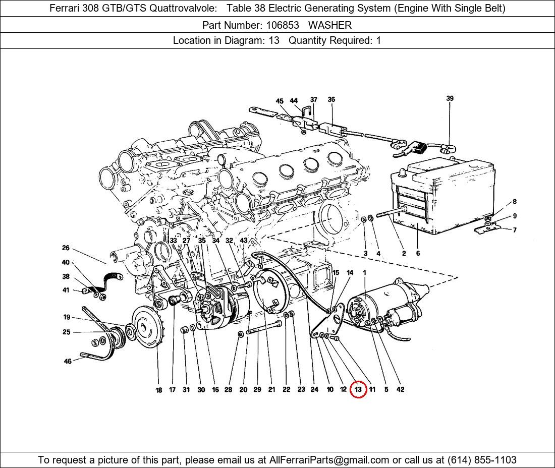 Ferrari Part Number 106853, WASHER shown here as used in Ferrari 308 GTB/GTS Quattrovalvole Table 38 Electric Generating System (Engine With Single Belt). Location in Diagram: 13. Required Quantity: 1. This Ferrari part is used in more than one diagram. Click on the diagrams below to see alternative uses of this part: