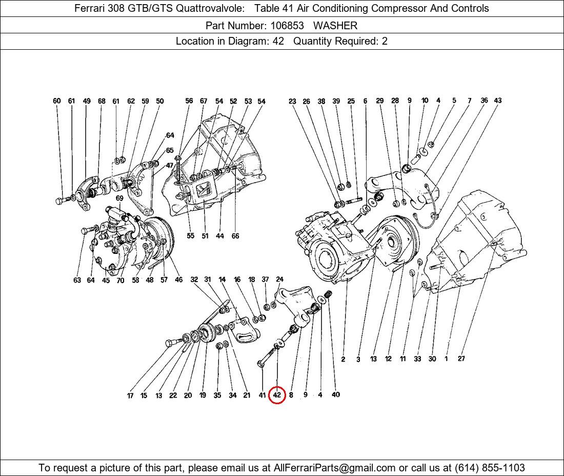 Ferrari Part Number 106853, WASHER shown here as used in Ferrari 308 GTB/GTS Quattrovalvole Table 41 Air Conditioning Compressor And Controls. Location in Diagram: 42. Required Quantity: 2. This Ferrari part is used in more than one diagram. Click on the diagrams below to see alternative uses of this part: