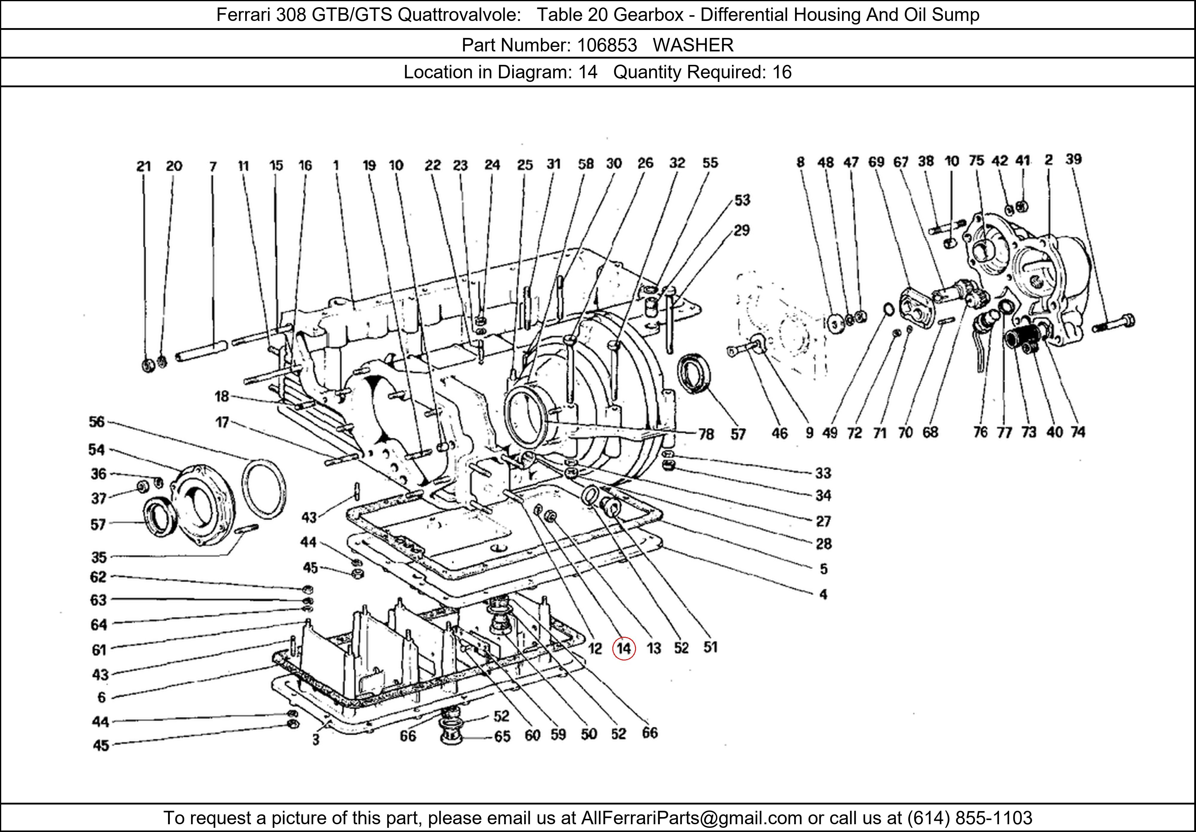 Ferrari Part Number 106853, WASHER shown here as used in Ferrari 308 GTB/GTS Quattrovalvole Table 20 Gearbox - Differential Housing And Oil Sump. Location in Diagram: 14. Required Quantity: 16. This Ferrari part is used in more than one diagram. Click on the diagrams below to see alternative uses of this part: