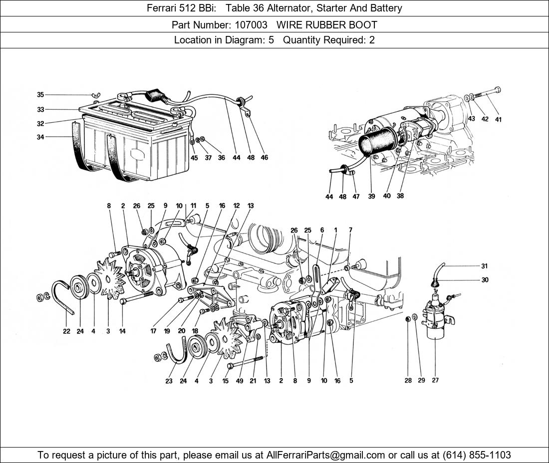 Ferrari Part 107003, WIRE RUBBER BOOT, shown here as used in Ferrari 512 BBi Table 36 Alternator, Starter And Battery. Other uses of this part are shown below: