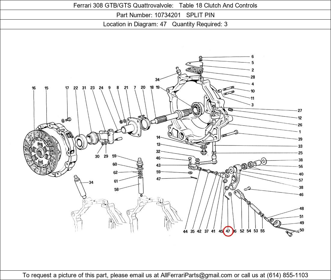 Ferrari Part Number 10734201, SPLIT PIN shown here as used in Ferrari 308 GTB/GTS Quattrovalvole Table 18 Clutch And Controls. Location in Diagram: 47. Required Quantity: 3. This Ferrari part is used in more than one diagram. Click on the diagrams below to see alternative uses of this part: