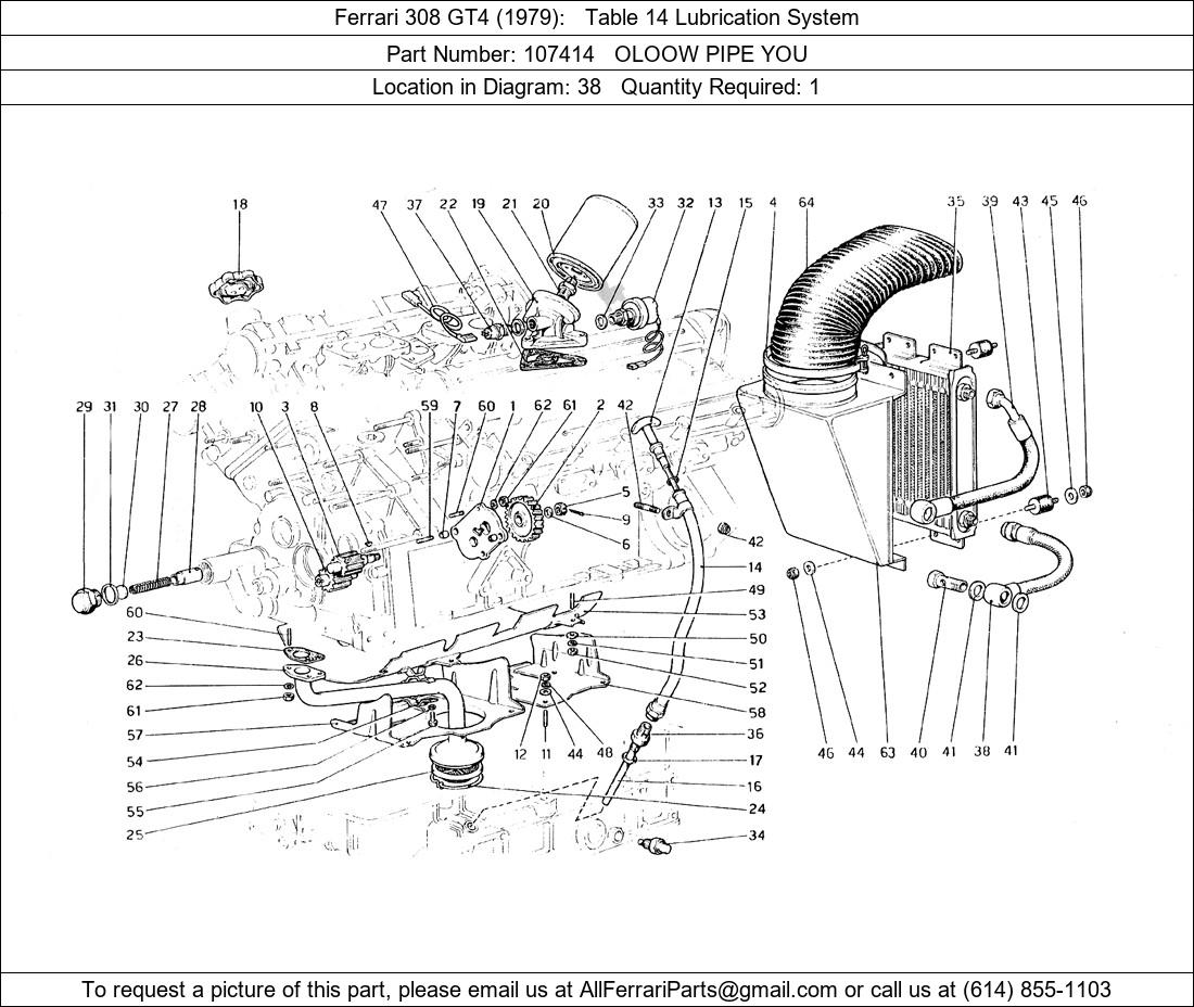 Ferrari Part 107414, OLOOW PIPE YOU, shown here as used in Ferrari 308 GT4 (1979) Table 14 Lubrication System. Other uses of this part are shown below: