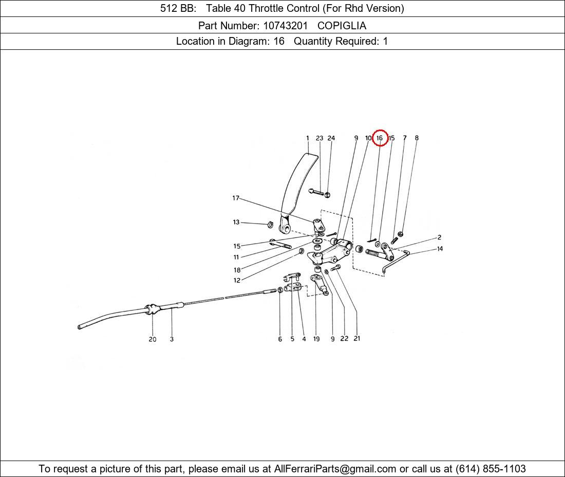 Ferrari Part Number 10743201, COPIGLIA shown here as used in 512 BB Table 40 Throttle Control (For Rhd Version). Location in Diagram: 16. Required Quantity: 1
