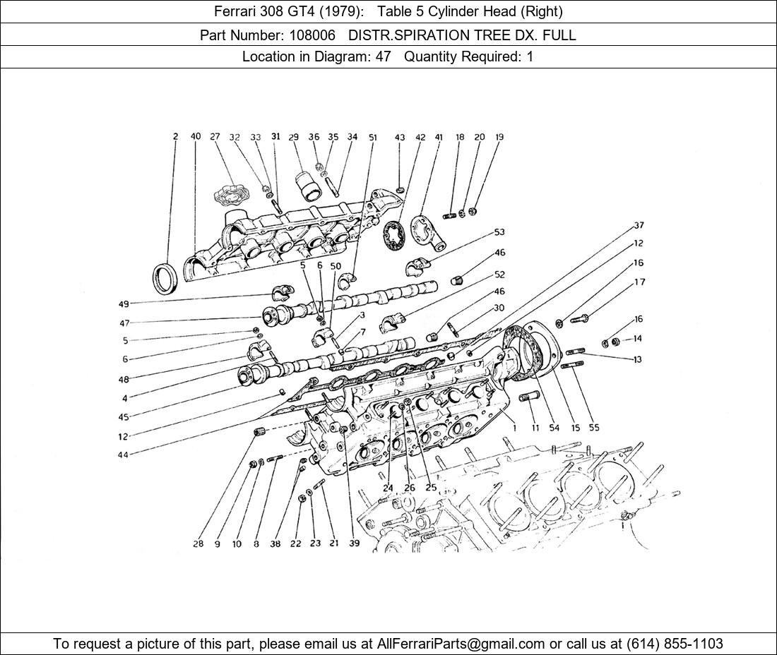 Ferrari Part 108006, DISTR.SPIRATION TREE DX. FULL, shown here as used in Ferrari 308 GT4 (1979) Table 5 Cylinder Head (Right). Other uses of this part are shown below: