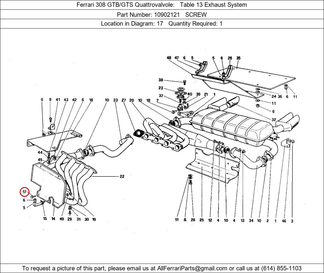 Ferrari Part Number 10902121, SCREW shown here as used in Ferrari 308 GTB/GTS Quattrovalvole Table 13 Exhaust System. Location in Diagram: 17. Required Quantity: 1. This Ferrari part is used in more than one diagram. Click on the diagrams below to see alternative uses of this part: