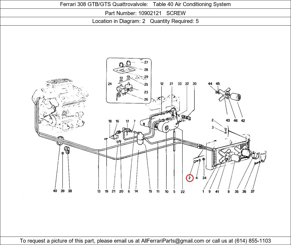 Ferrari Part Number 10902121, SCREW shown here as used in Ferrari 308 GTB/GTS Quattrovalvole Table 40 Air Conditioning System. Location in Diagram: 2. Required Quantity: 5. This Ferrari part is used in more than one diagram. Click on the diagrams below to see alternative uses of this part: