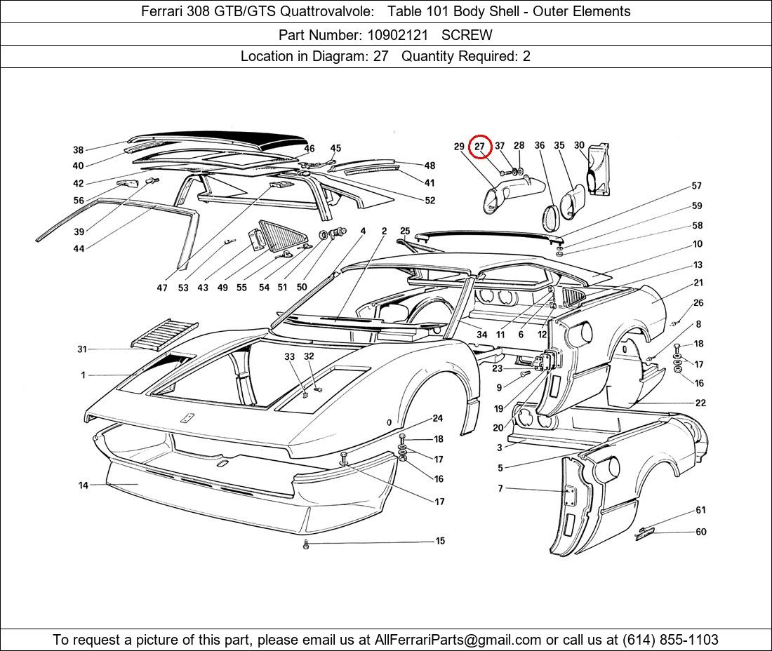 Ferrari Part Number 10902121, SCREW shown here as used in Ferrari 308 GTB/GTS Quattrovalvole Table 101 Body Shell - Outer Elements. Location in Diagram: 27. Required Quantity: 2. This Ferrari part is used in more than one diagram. Click on the diagrams below to see alternative uses of this part: