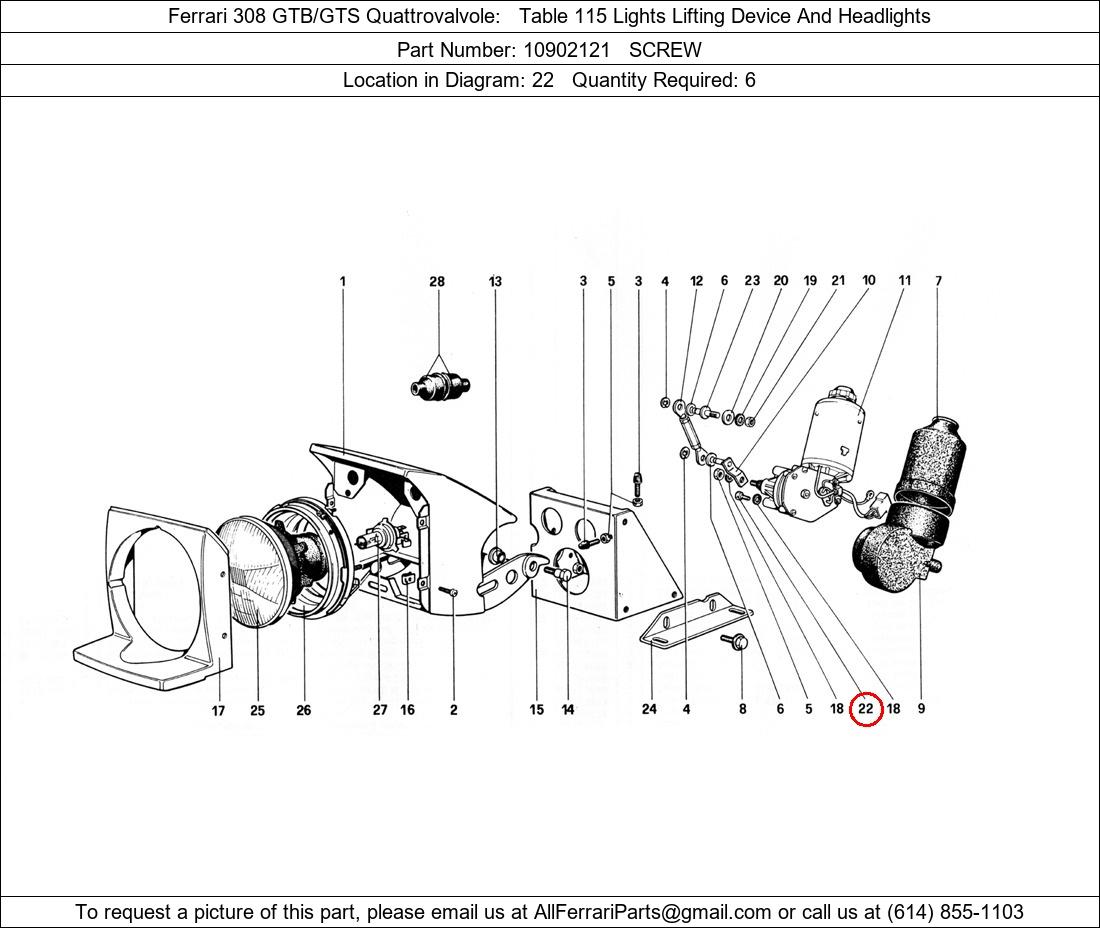 Ferrari Part Number 10902121, SCREW shown here as used in Ferrari 308 GTB/GTS Quattrovalvole Table 115 Lights Lifting Device And Headlights. Location in Diagram: 22. Required Quantity: 6. This Ferrari part is used in more than one diagram. Click on the diagrams below to see alternative uses of this part: