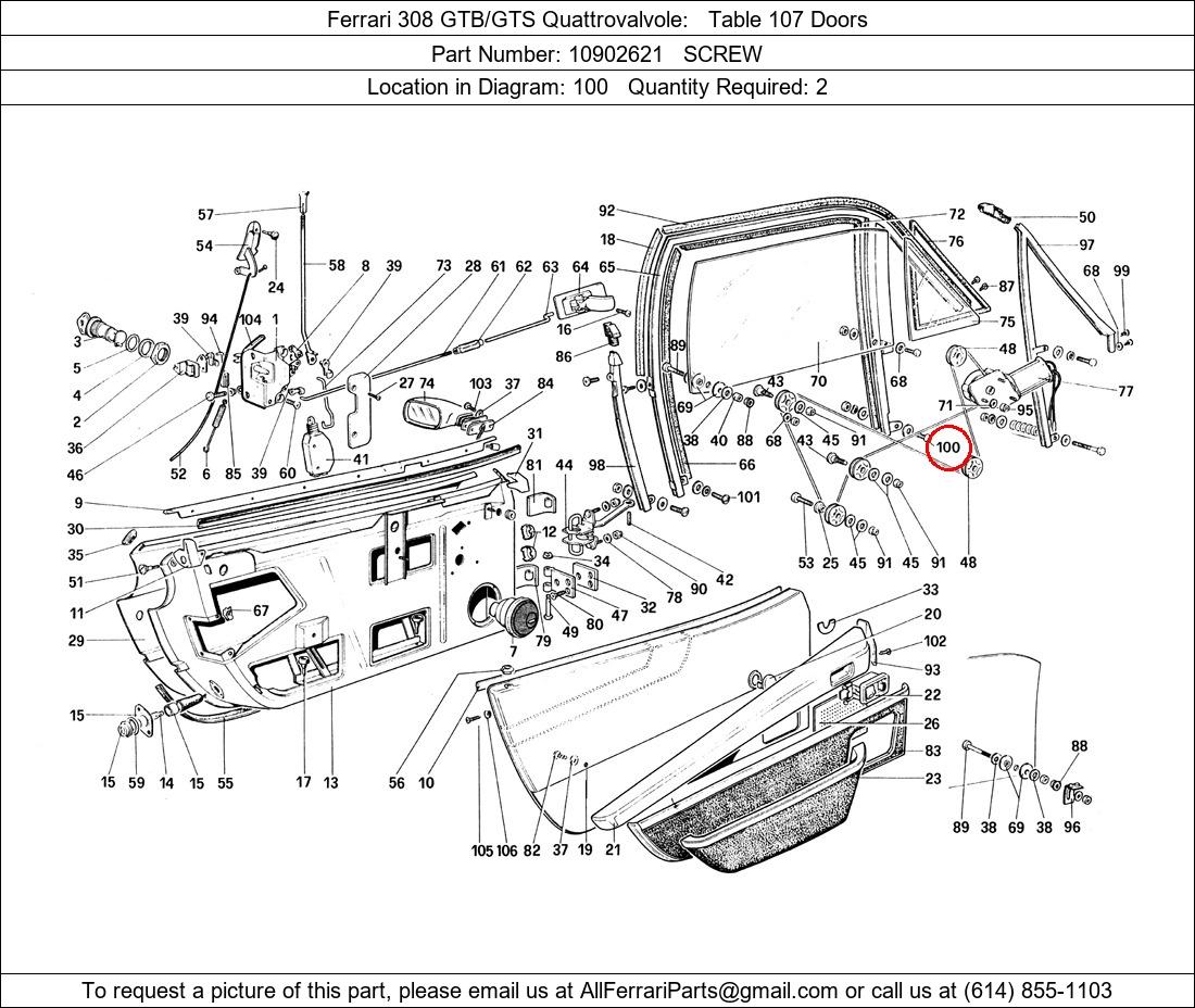 Ferrari Part Number 10902621, SCREW shown here as used in Ferrari 308 GTB/GTS Quattrovalvole Table 107 Doors. Location in Diagram: 100. Required Quantity: 2. This Ferrari part is used in more than one diagram. Click on the diagrams below to see alternative uses of this part: