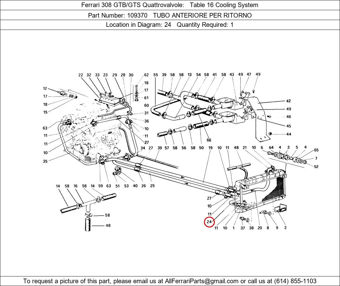 Ferrari Part Number 109370, TUBO ANTERIORE PER RITORNO shown here as used in Ferrari 308 GTB/GTS Quattrovalvole Table 16 Cooling System. Location in Diagram: 24. Required Quantity: 1. This Ferrari part is used in more than one diagram. Click on the diagrams below to see alternative uses of this part: