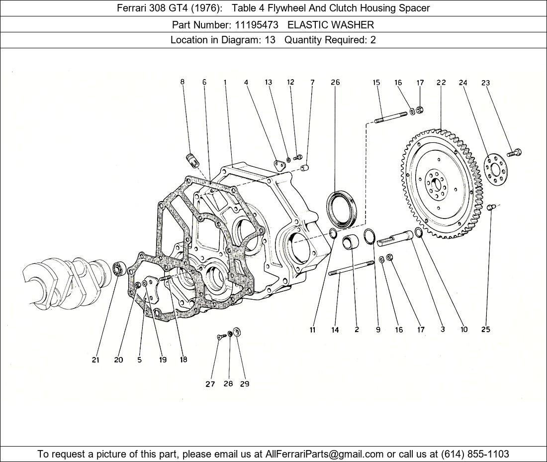 Ferrari Part 11195473, ELASTIC WASHER, shown here as used in Ferrari 308 GT4 (1976) Table 4 Flywheel And Clutch Housing Spacer. Other uses of this part are shown below:
