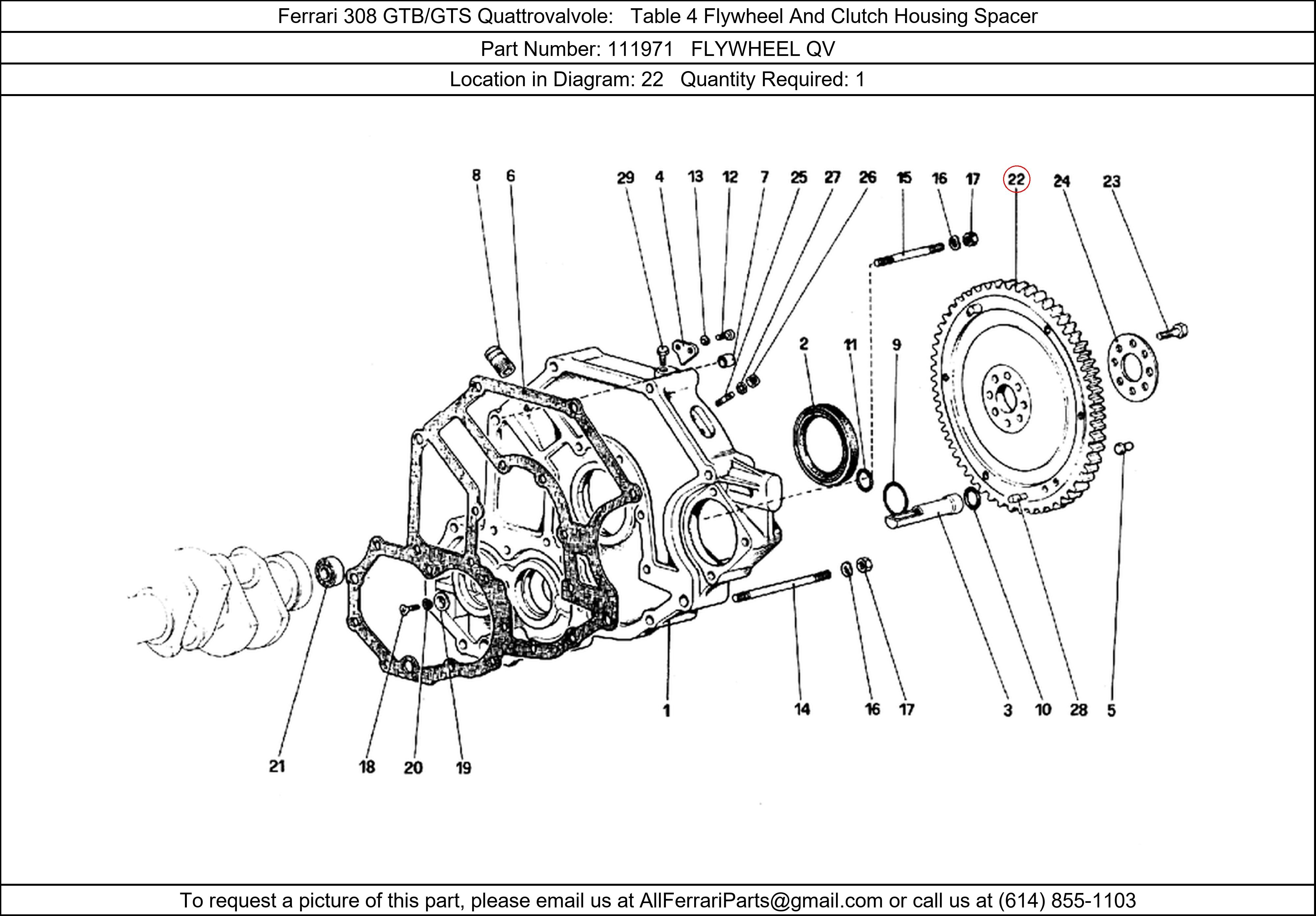 Ferrari Part Number 111971, FLYWHEEL QV shown here as used in Ferrari 308 GTB/GTS Quattrovalvole Table 4 Flywheel And Clutch Housing Spacer. Location in Diagram: 22. Required Quantity: 1. This Ferrari part is used in more than one diagram. Click on the diagrams below to see alternative uses of this part: