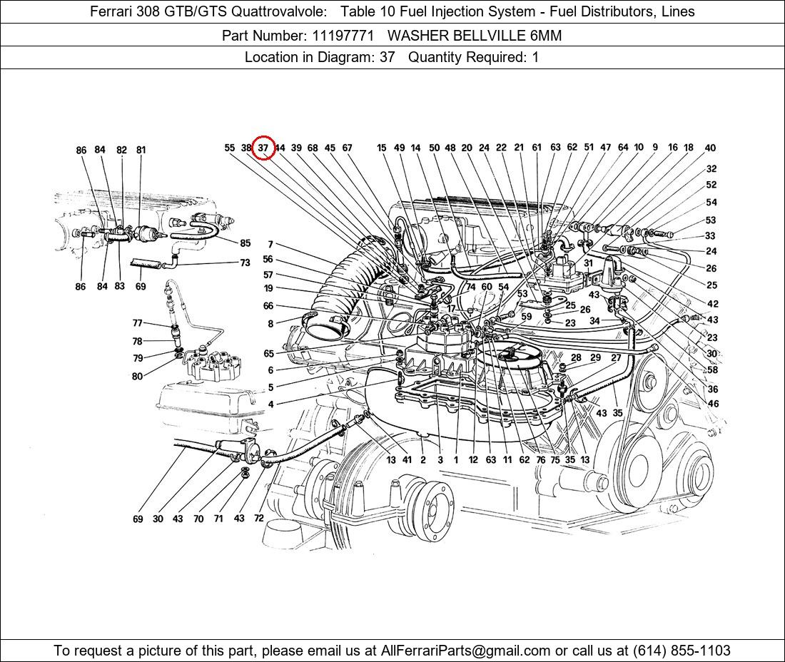 Ferrari Part Number 11197771, WASHER BELLVILLE 6MM shown here as used in Ferrari 308 GTB/GTS Quattrovalvole Table 10 Fuel Injection System - Fuel Distributors, Lines. Location in Diagram: 37. Required Quantity: 1. This Ferrari part is used in more than one diagram. Click on the diagrams below to see alternative uses of this part: