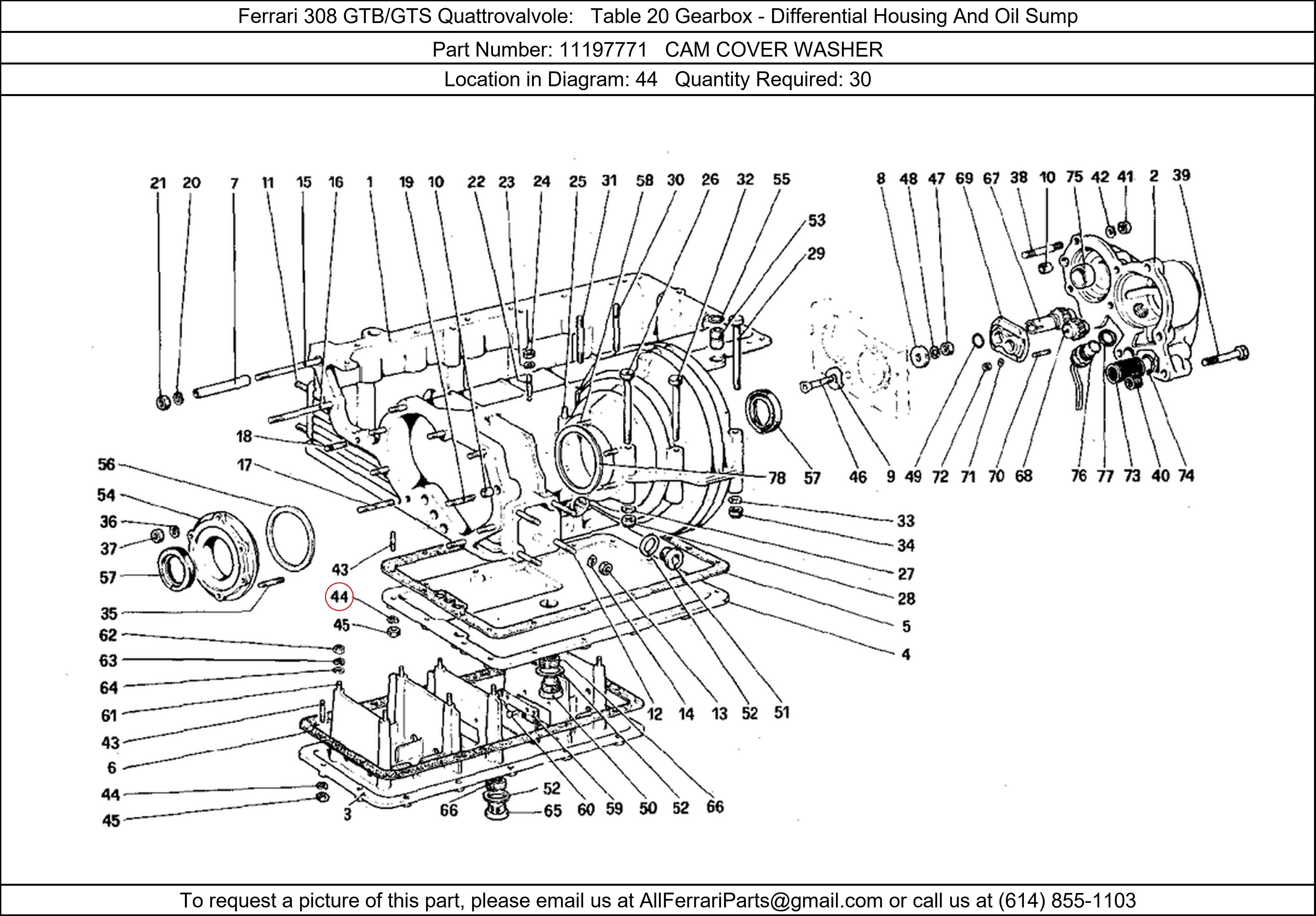 Ferrari Part Number 11197771, CAM COVER WASHER shown here as used in Ferrari 308 GTB/GTS Quattrovalvole Table 20 Gearbox - Differential Housing And Oil Sump. Location in Diagram: 44. Required Quantity: 30. This Ferrari part is used in more than one diagram. Click on the diagrams below to see alternative uses of this part: