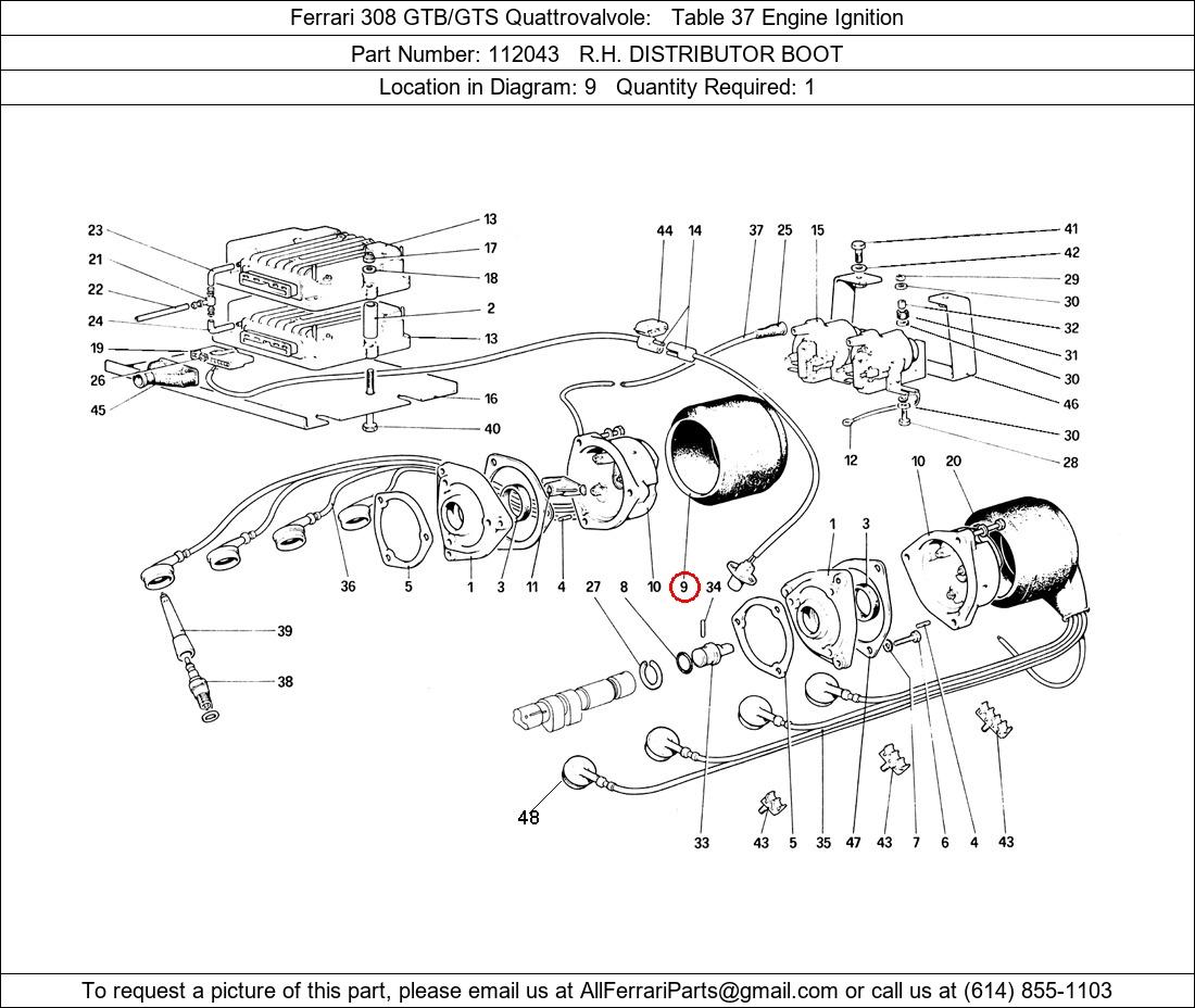 Ferrari Part Number 112043, R.H. DISTRIBUTOR BOOT shown here as used in Ferrari 308 GTB/GTS Quattrovalvole Table 37 Engine Ignition. Location in Diagram: 9. Required Quantity: 1. This Ferrari part is used in more than one diagram. Click on the diagrams below to see alternative uses of this part: