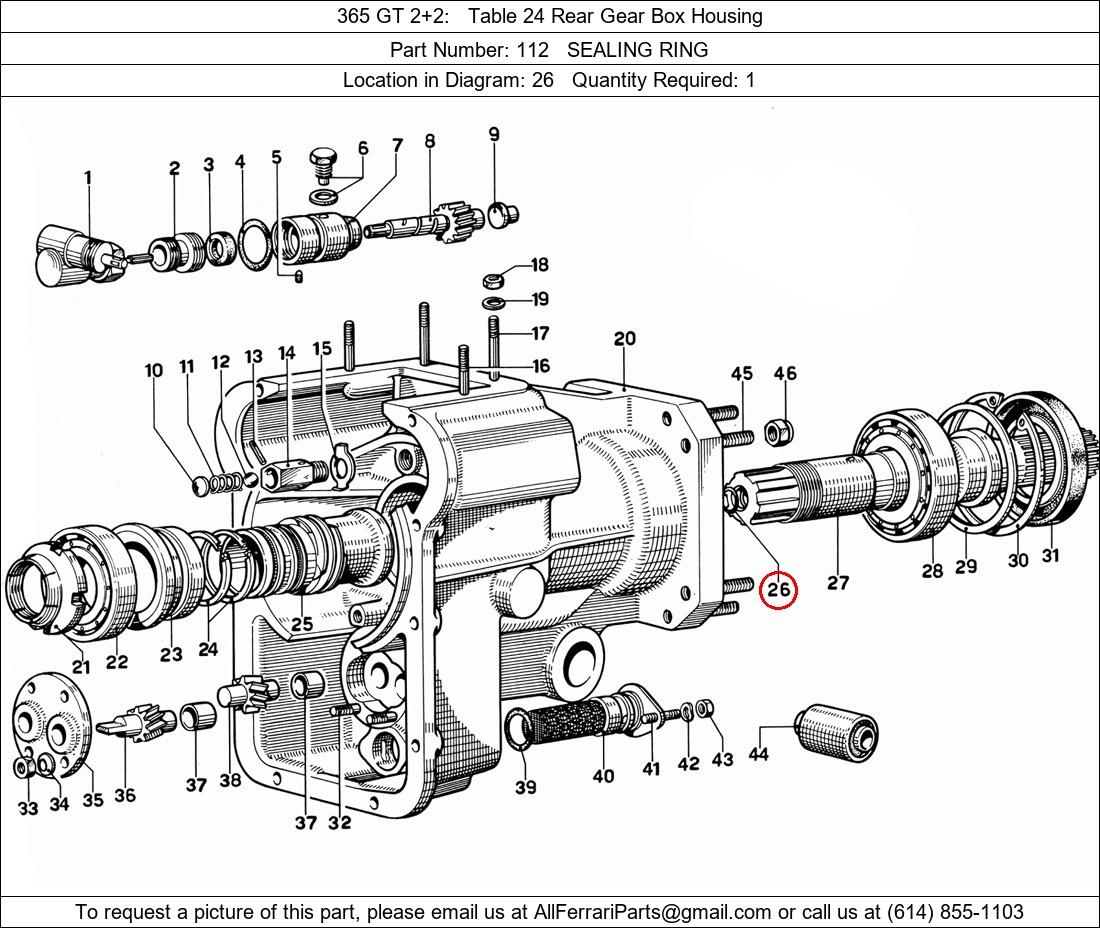 Ferrari Part Number 112, SEALING RING shown here as used in 365 GT 2+2 Table 24 Rear Gear Box Housing. Location in Diagram: 26. Required Quantity: 1