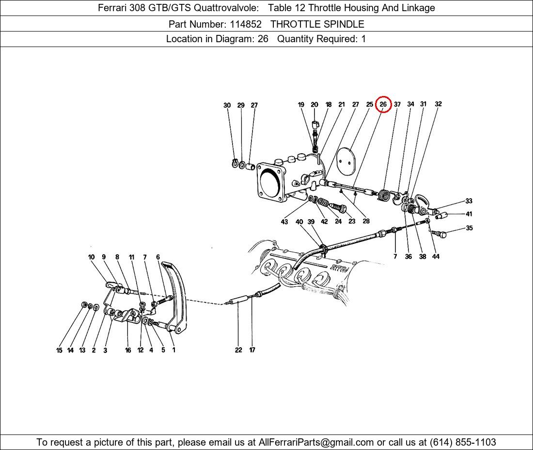 Ferrari Part Number 114852, THROTTLE SPINDLE shown here as used in Ferrari 308 GTB/GTS Quattrovalvole Table 12 Throttle Housing And Linkage. Location in Diagram: 26. Required Quantity: 1. This Ferrari part is used in more than one diagram. Click on the diagrams below to see alternative uses of this part: