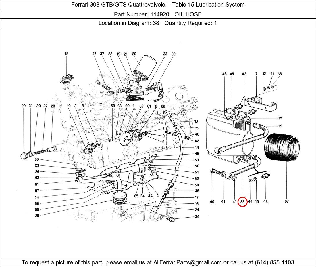 Ferrari Part Number 114920, OIL HOSE shown here as used in Ferrari 308 GTB/GTS Quattrovalvole Table 15 Lubrication System. Location in Diagram: 38. Required Quantity: 1. This Ferrari part is used in more than one diagram. Click on the diagrams below to see alternative uses of this part: