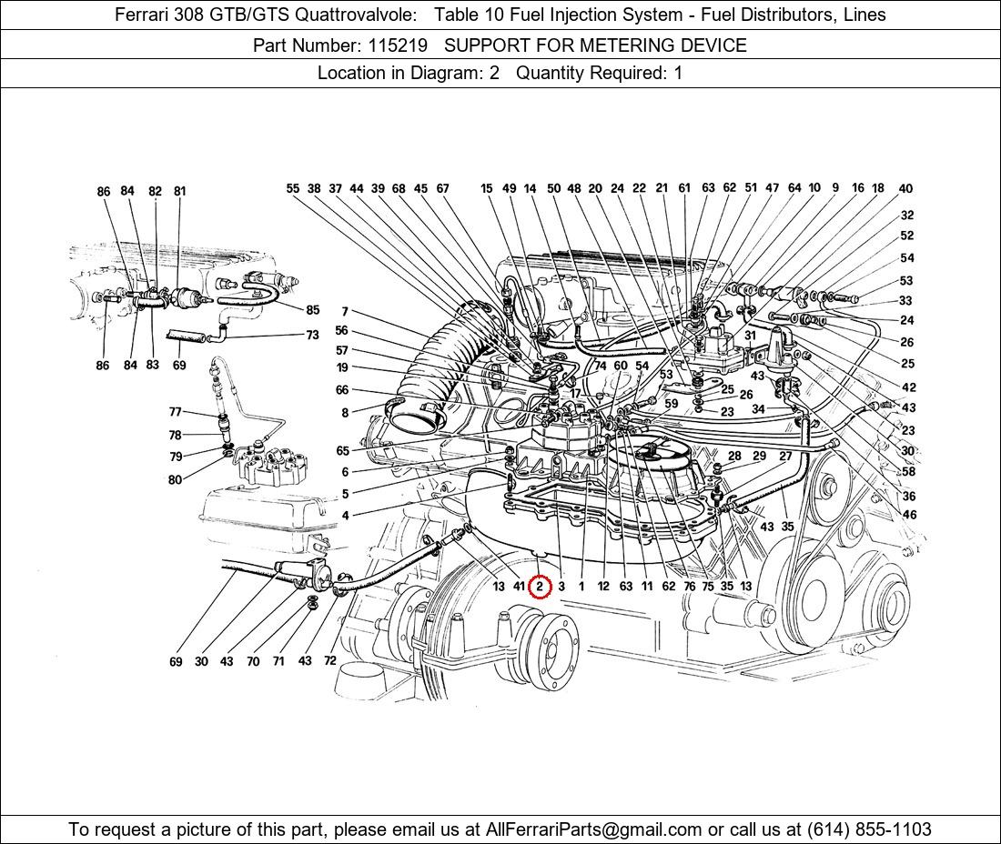 Ferrari Part Number 115219, SUPPORT FOR METERING DEVICE shown here as used in Ferrari 308 GTB/GTS Quattrovalvole Table 10 Fuel Injection System - Fuel Distributors, Lines. Location in Diagram: 2. Required Quantity: 1. This Ferrari part is used in more than one diagram. Click on the diagrams below to see alternative uses of this part: