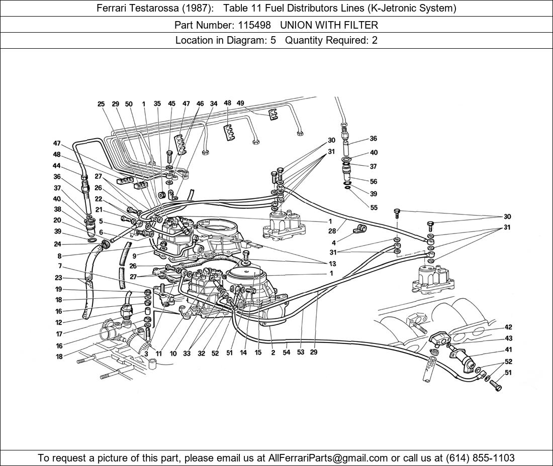 Ferrari Part 115498, UNION WITH FILTER, shown here as used in Ferrari Testarossa (1987) Table 11 Fuel Distributors Lines (K-Jetronic System). Other uses of this part are shown below: