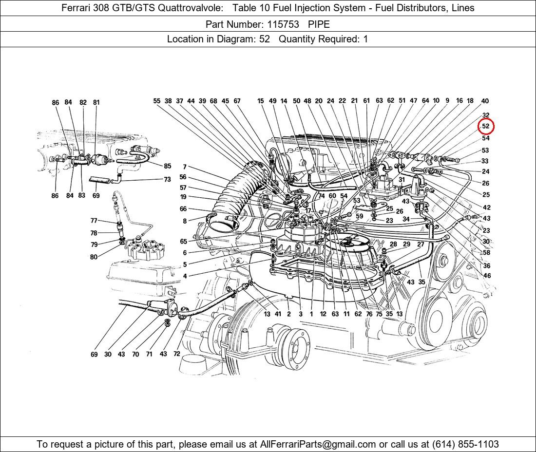 Ferrari Part Number 115753, PIPE shown here as used in Ferrari 308 GTB/GTS Quattrovalvole Table 10 Fuel Injection System - Fuel Distributors, Lines. Location in Diagram: 52. Required Quantity: 1
