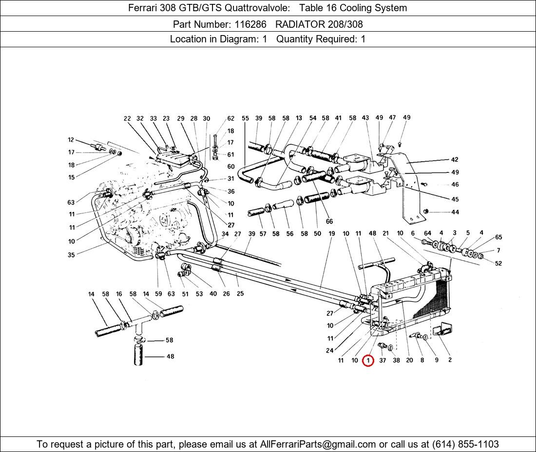 Ferrari Part Number 116286, RADIATOR 208/308 shown here as used in Ferrari 308 GTB/GTS Quattrovalvole Table 16 Cooling System. Location in Diagram: 1. Required Quantity: 1. This Ferrari part is used in more than one diagram. Click on the diagrams below to see alternative uses of this part: