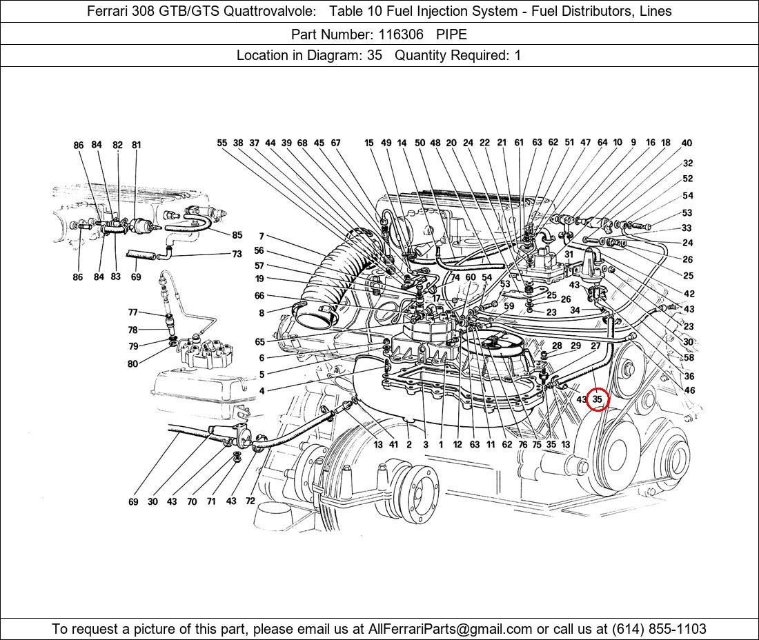 Ferrari Part Number 116306, PIPE shown here as used in Ferrari 308 GTB/GTS Quattrovalvole Table 10 Fuel Injection System - Fuel Distributors, Lines. Location in Diagram: 35. Required Quantity: 1. This Ferrari part is used in more than one diagram. Click on the diagrams below to see alternative uses of this part: