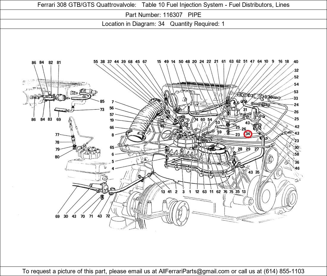 Ferrari Part Number 116307, PIPE shown here as used in Ferrari 308 GTB/GTS Quattrovalvole Table 10 Fuel Injection System - Fuel Distributors, Lines. Location in Diagram: 34. Required Quantity: 1. This Ferrari part is used in more than one diagram. Click on the diagrams below to see alternative uses of this part: