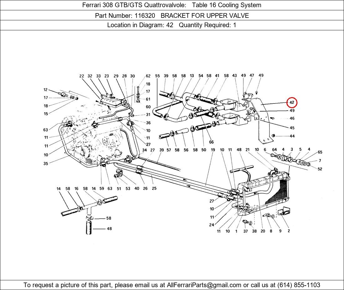 Ferrari Part Number 116320, BRACKET FOR UPPER VALVE shown here as used in Ferrari 308 GTB/GTS Quattrovalvole Table 16 Cooling System. Location in Diagram: 42. Required Quantity: 1. This Ferrari part is used in more than one diagram. Click on the diagrams below to see alternative uses of this part: