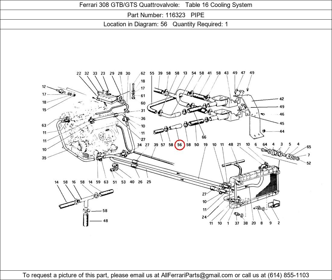 Ferrari Part Number 116323, PIPE shown here as used in Ferrari 308 GTB/GTS Quattrovalvole Table 16 Cooling System. Location in Diagram: 56. Required Quantity: 1. This Ferrari part is used in more than one diagram. Click on the diagrams below to see alternative uses of this part: