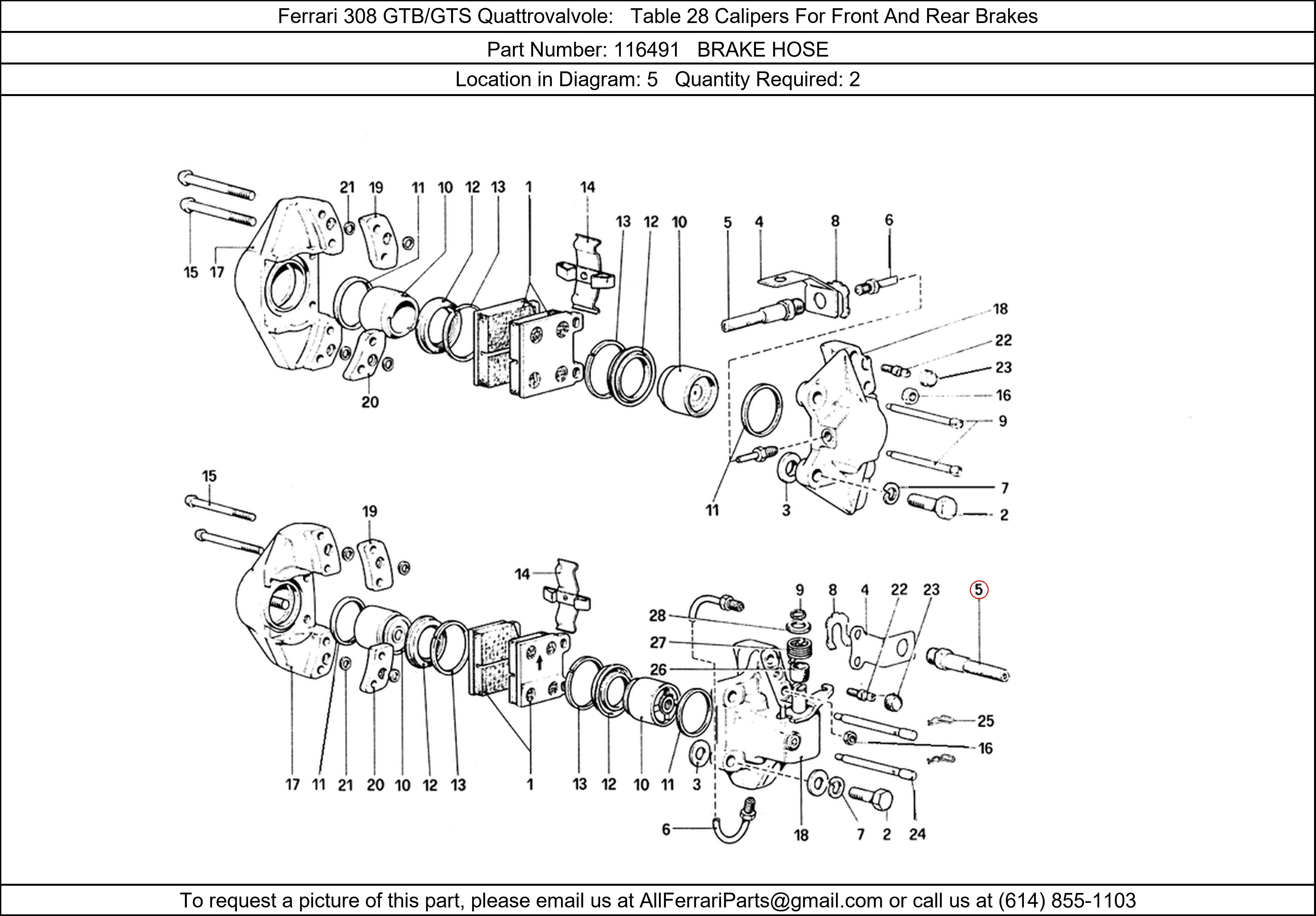 Ferrari Part Number 116491, BRAKE HOSE shown here as used in Ferrari 308 GTB/GTS Quattrovalvole Table 28 Calipers For Front And Rear Brakes. Location in Diagram: 5. Required Quantity: 2. This Ferrari part is used in more than one diagram. Click on the diagrams below to see alternative uses of this part:
