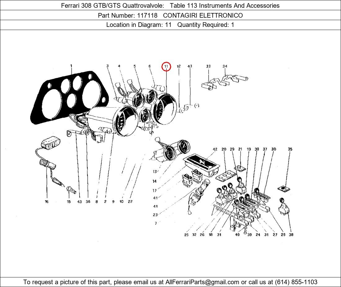 Ferrari Part Number 117118, CONTAGIRI ELETTRONICO shown here as used in Ferrari 308 GTB/GTS Quattrovalvole Table 113 Instruments And Accessories. Location in Diagram: 11. Required Quantity: 1. This Ferrari part is used in more than one diagram. Click on the diagrams below to see alternative uses of this part: