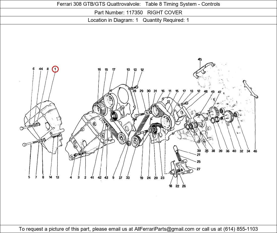Ferrari Part Number 117350, RIGHT COVER shown here as used in Ferrari 308 GTB/GTS Quattrovalvole Table 8 Timing System - Controls. Location in Diagram: 1. Required Quantity: 1. This Ferrari part is used in more than one diagram. Click on the diagrams below to see alternative uses of this part: