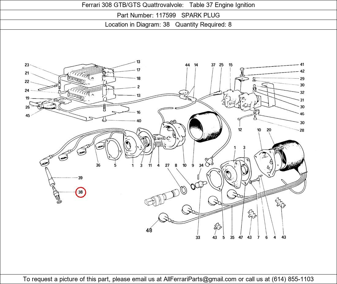 Ferrari Part Number 117599, SPARK PLUG shown here as used in Ferrari 308 GTB/GTS Quattrovalvole Table 37 Engine Ignition. Location in Diagram: 38. Required Quantity: 8. This Ferrari part is used in more than one diagram. Click on the diagrams below to see alternative uses of this part: