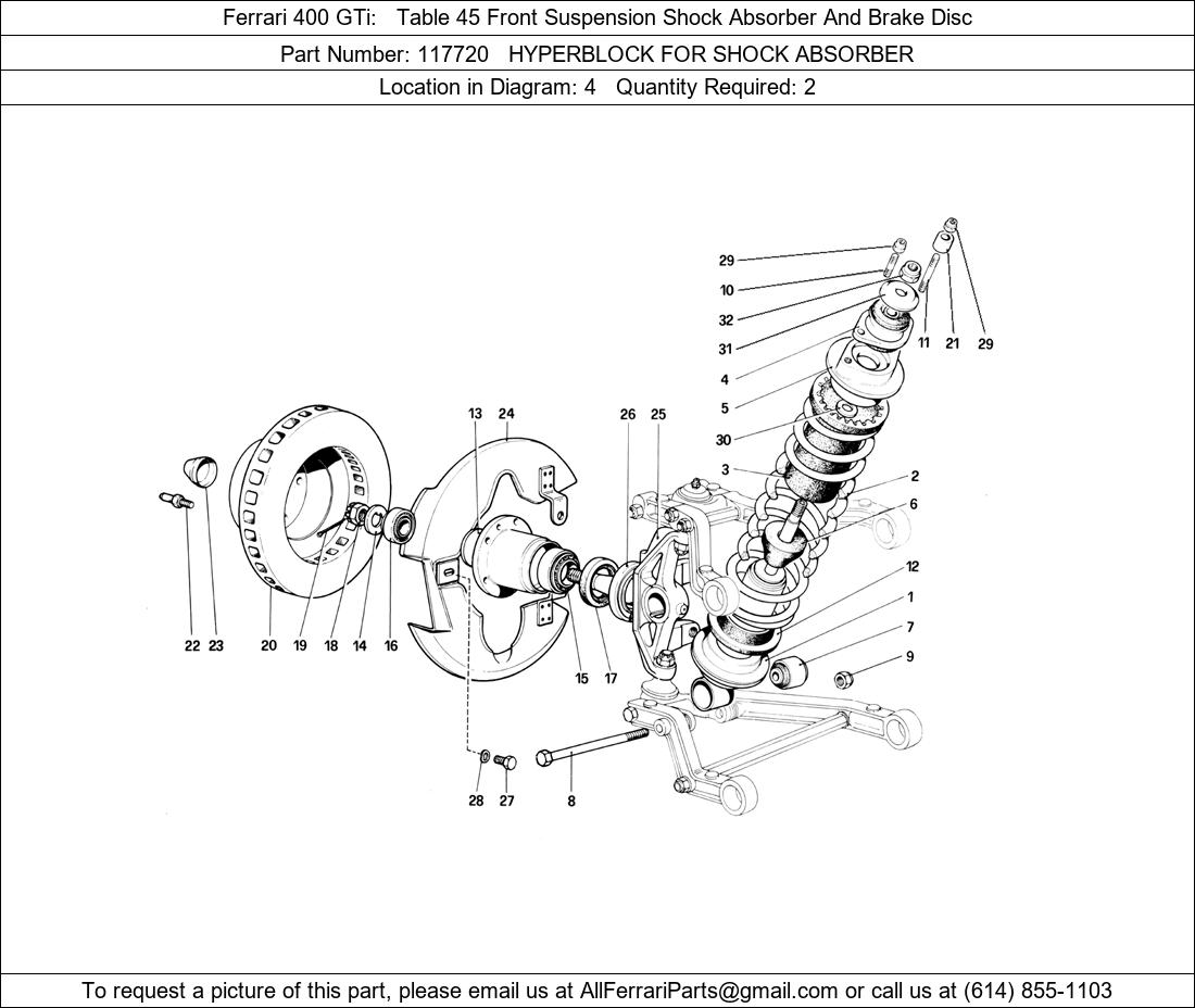 Ferrari Part 117720, HYPERBLOCK FOR SHOCK ABSORBER, shown here as used in Ferrari 400 GTi Table 45 Front Suspension Shock Absorber And Brake Disc. Other uses of this part are shown below:
