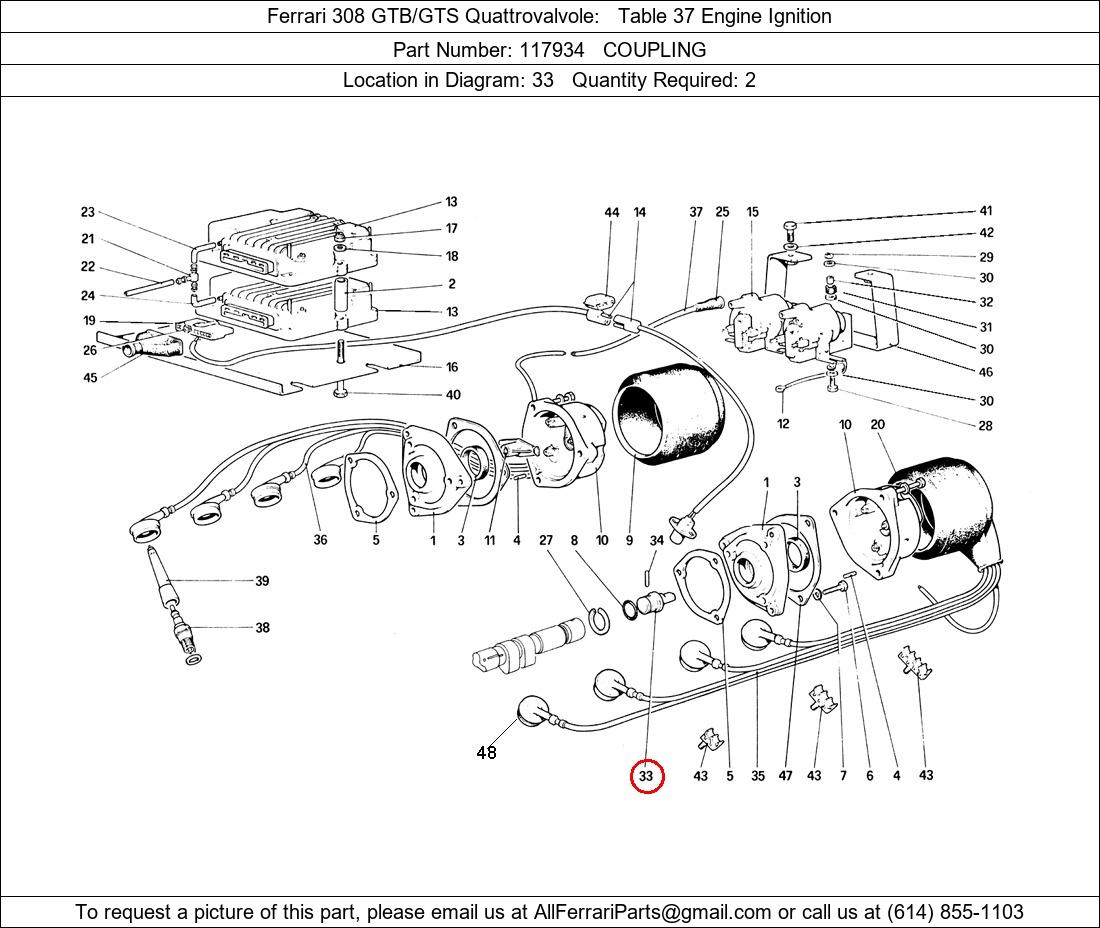 Ferrari Part Number 117934, COUPLING shown here as used in Ferrari 308 GTB/GTS Quattrovalvole Table 37 Engine Ignition. Location in Diagram: 33. Required Quantity: 2. This Ferrari part is used in more than one diagram. Click on the diagrams below to see alternative uses of this part:
