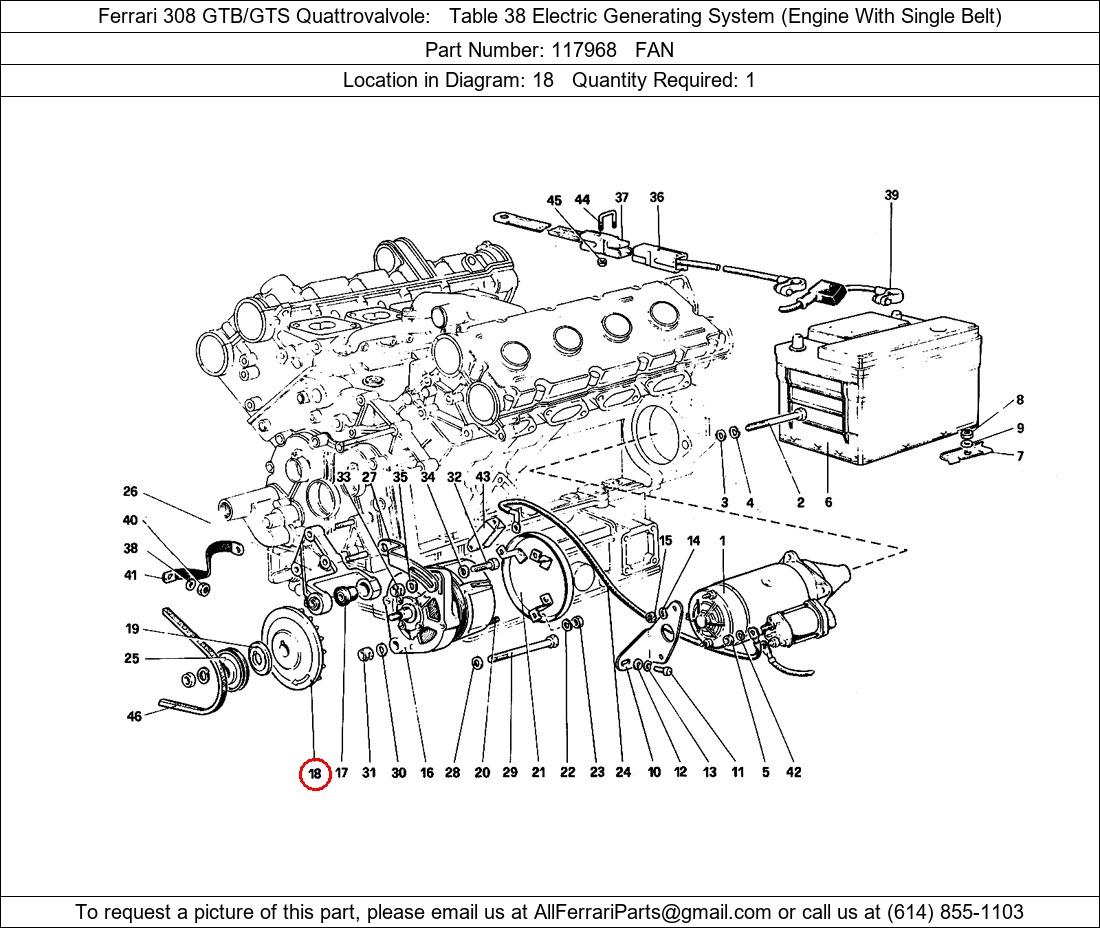 Ferrari Part Number 117968, FAN shown here as used in Ferrari 308 GTB/GTS Quattrovalvole Table 38 Electric Generating System (Engine With Single Belt). Location in Diagram: 18. Required Quantity: 1. This Ferrari part is used in more than one diagram. Click on the diagrams below to see alternative uses of this part: