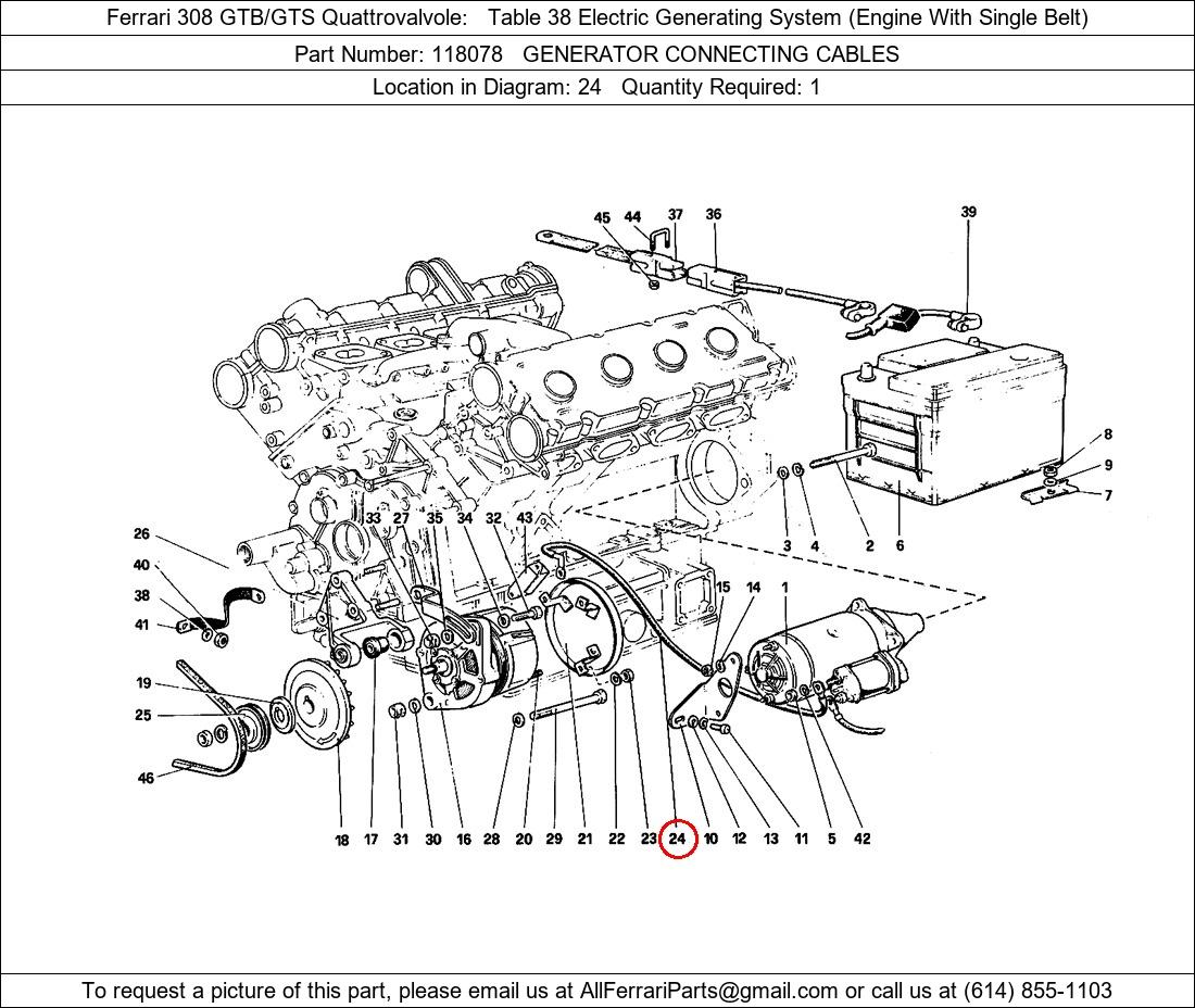 Ferrari Part Number 118078, GENERATOR CONNECTING CABLES shown here as used in Ferrari 308 GTB/GTS Quattrovalvole Table 38 Electric Generating System (Engine With Single Belt). Location in Diagram: 24. Required Quantity: 1