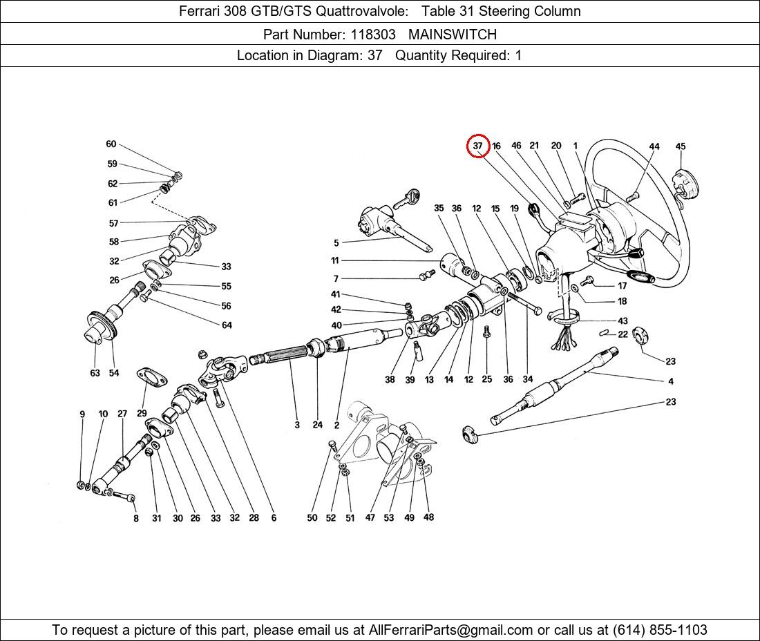 Ferrari Part Number 118303, MAINSWITCH shown here as used in Ferrari 308 GTB/GTS Quattrovalvole Table 31 Steering Column. Location in Diagram: 37. Required Quantity: 1. This Ferrari part is used in more than one diagram. Click on the diagrams below to see alternative uses of this part: