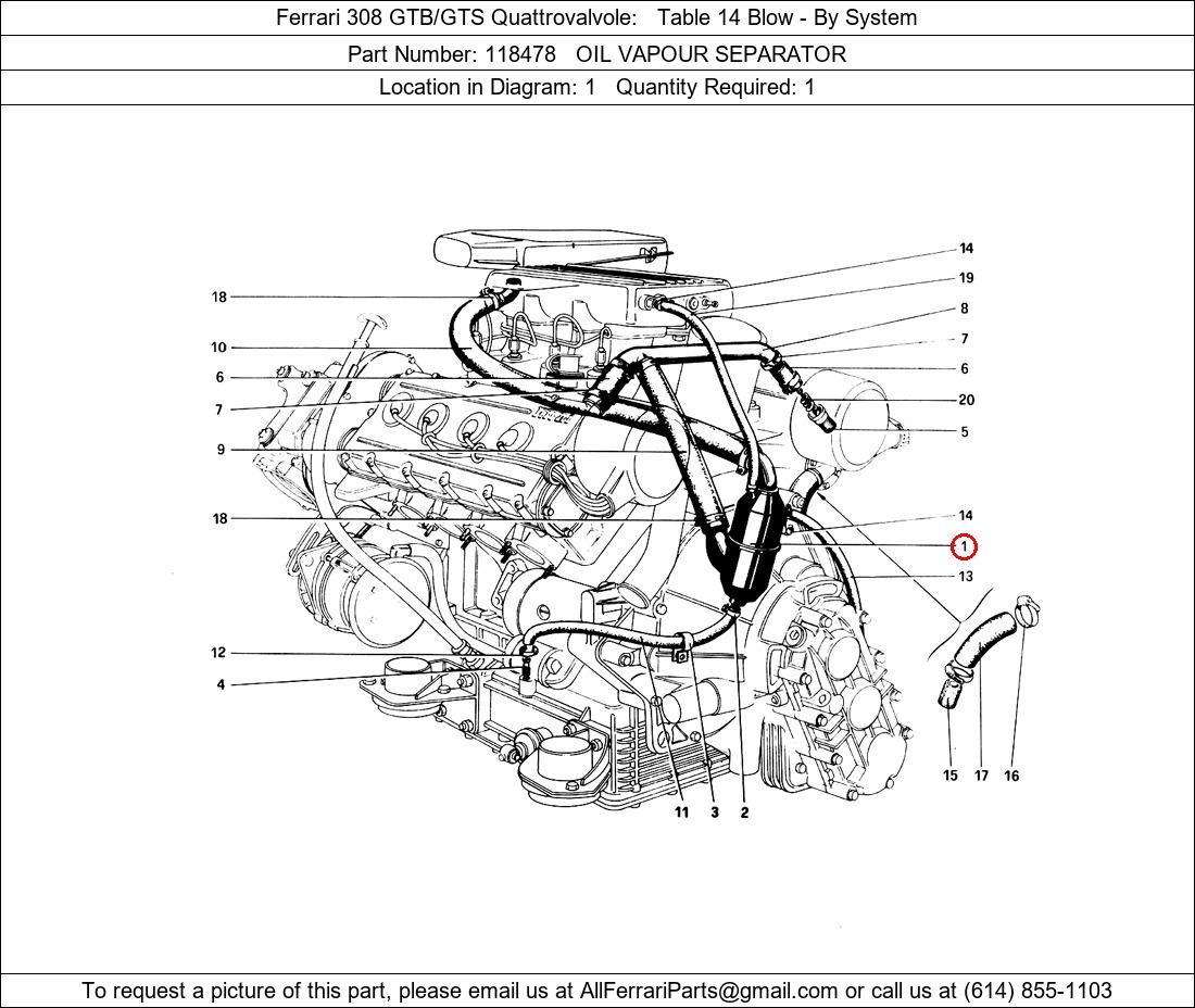 Ferrari Part Number 118478, OIL VAPOUR SEPARATOR shown here as used in Ferrari 308 GTB/GTS Quattrovalvole Table 14 Blow - By System. Location in Diagram: 1. Required Quantity: 1. This Ferrari part is used in more than one diagram. Click on the diagrams below to see alternative uses of this part: