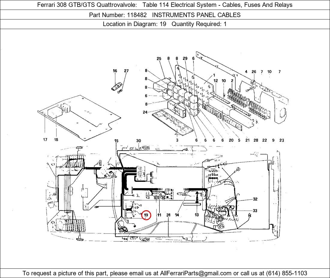 Ferrari Part Number 118482, INSTRUMENTS PANEL CABLES shown here as used in Ferrari 308 GTB/GTS Quattrovalvole Table 114 Electrical System - Cables, Fuses And Relays. Location in Diagram: 19. Required Quantity: 1