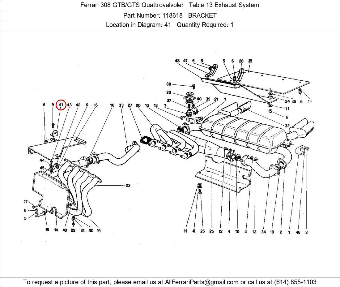 Ferrari Part Number 118618, BRACKET shown here as used in Ferrari 308 GTB/GTS Quattrovalvole Table 13 Exhaust System. Location in Diagram: 41. Required Quantity: 1. This Ferrari part is used in more than one diagram. Click on the diagrams below to see alternative uses of this part: