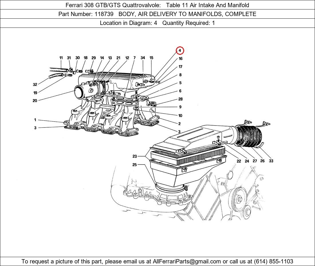 Ferrari Part Number 118739, BODY, AIR DELIVERY TO MANIFOLDS, COMPLETE shown here as used in Ferrari 308 GTB/GTS Quattrovalvole Table 11 Air Intake And Manifold. Location in Diagram: 4. Required Quantity: 1. This Ferrari part is used in more than one diagram. Click on the diagrams below to see alternative uses of this part: