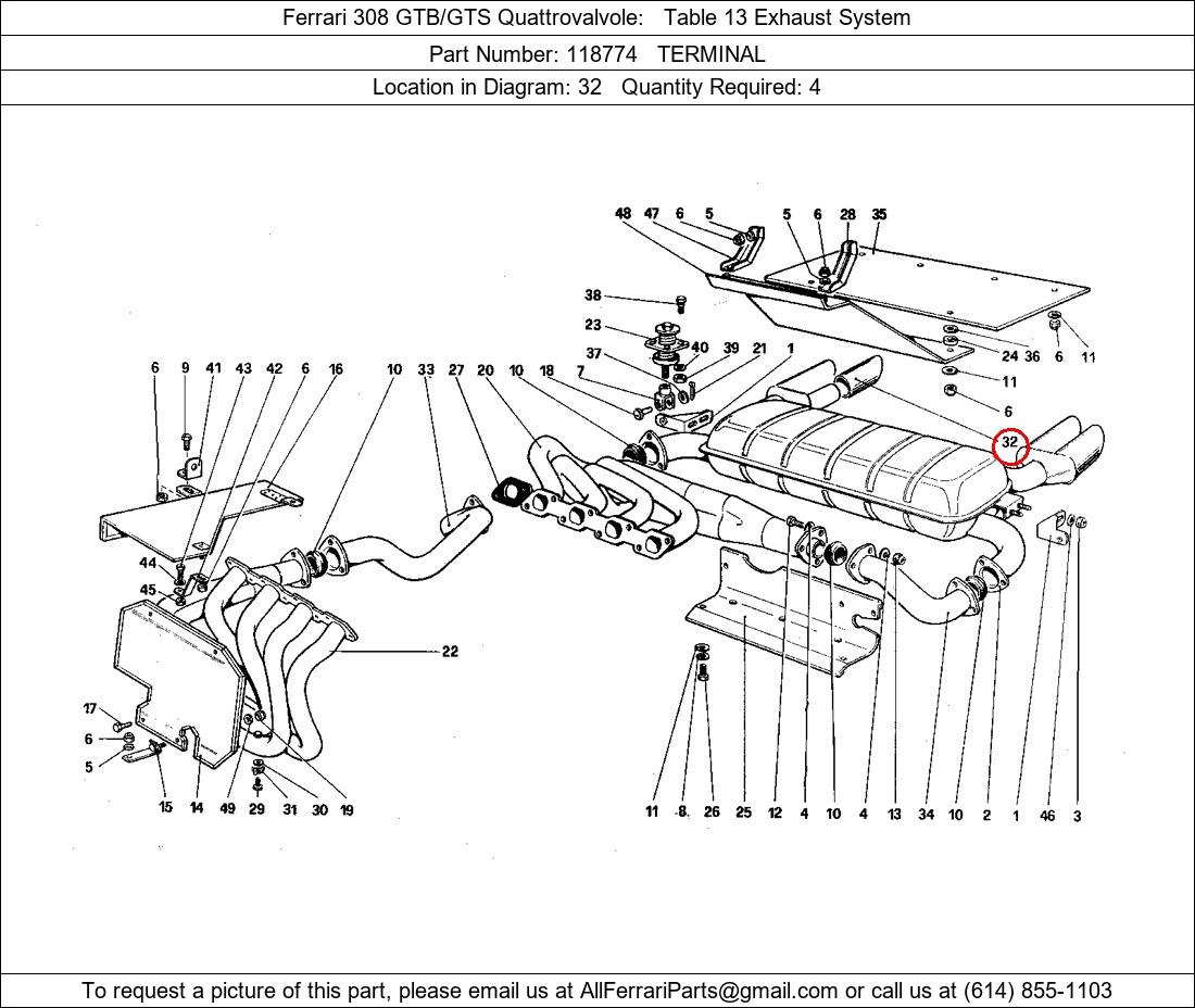 Ferrari Part Number 118774, TERMINAL shown here as used in Ferrari 308 GTB/GTS Quattrovalvole Table 13 Exhaust System. Location in Diagram: 32. Required Quantity: 4. This Ferrari part is used in more than one diagram. Click on the diagrams below to see alternative uses of this part: