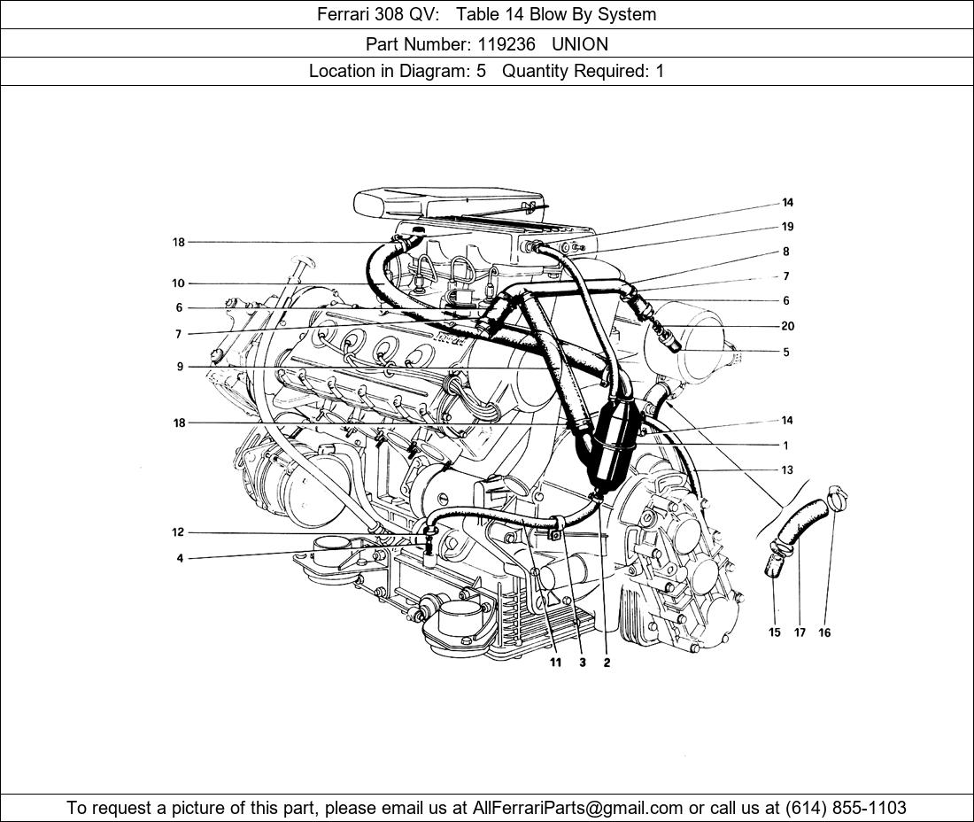 Ferrari Part 119236, UNION, shown here as used in Ferrari 308 QV Table 14 Blow By System. Other uses of this part are shown below: