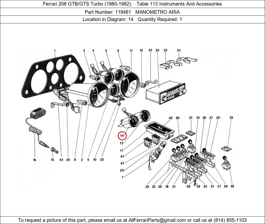 Ferrari Part Number 119461, MANOMETRO ARIA shown here as used in Ferrari 208 GTB/GTS Turbo (1980-1982) Table 113 Instruments And Accessories. Location in Diagram: 14. Required Quantity: 1