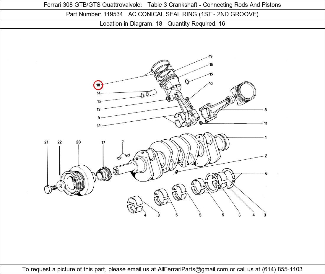 Ferrari Part Number 119534, AC CONICAL SEAL RING (1ST - 2ND GROOVE) shown here as used in Ferrari 308 GTB/GTS Quattrovalvole Table 3 Crankshaft - Connecting Rods And Pistons. Location in Diagram: 18. Required Quantity: 16. This Ferrari part is used in more than one diagram. Click on the diagrams below to see alternative uses of this part: