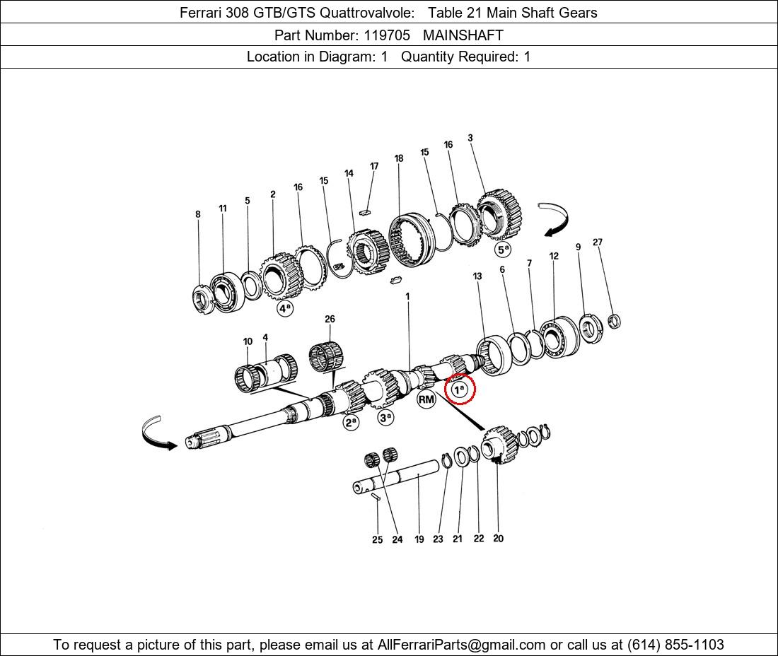 Ferrari Part Number 119705, MAINSHAFT shown here as used in Ferrari 308 GTB/GTS Quattrovalvole Table 21 Main Shaft Gears. Location in Diagram: 1. Required Quantity: 1. This Ferrari part is used in more than one diagram. Click on the diagrams below to see alternative uses of this part: