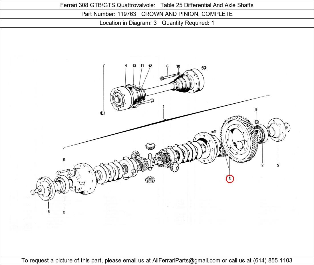 Ferrari Part Number 119763, CROWN AND PINION, COMPLETE shown here as used in Ferrari 308 GTB/GTS Quattrovalvole Table 25 Differential And Axle Shafts. Location in Diagram: 3. Required Quantity: 1. This Ferrari part is used in more than one diagram. Click on the diagrams below to see alternative uses of this part: